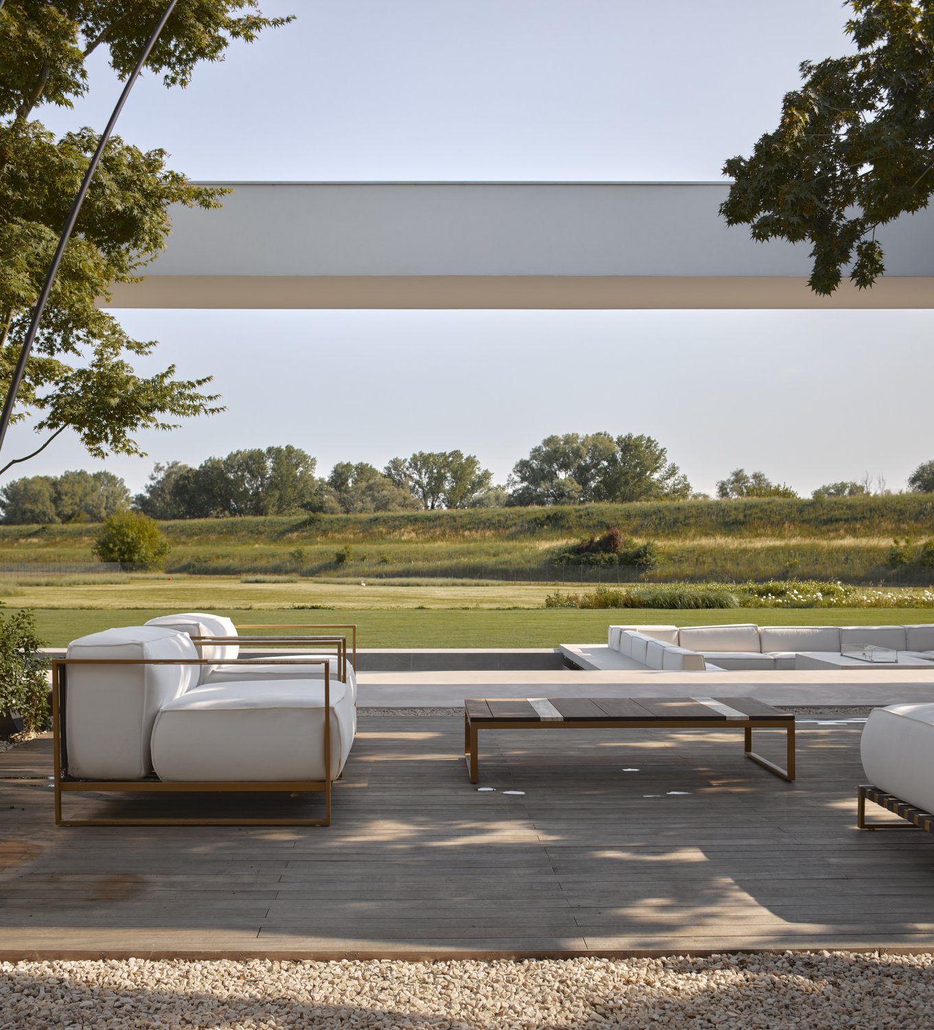 Il paesaggio della pianura, scandito da campi e argini, è l’orizzonte in cui si inserisce una villa familiare. Due olmi hollandica “Jacqueline Hillier” accolgono alla soglia d’ingresso: alberi dalle forme irregolari ma scultoree, analoghi e diversi, sembrano avvicinarsi a chi si accosta alla villa. Il primo esce da una sinuosa siepe di osmarea, l’altro lo segue stagliandosi sul muro bianco della casa. Le loro foglie piccole, scure, arrotondate permettono di riposare lo sguardo dopo avere attraversato il viale di ghiaia chiara, tagliata, spigolosa.