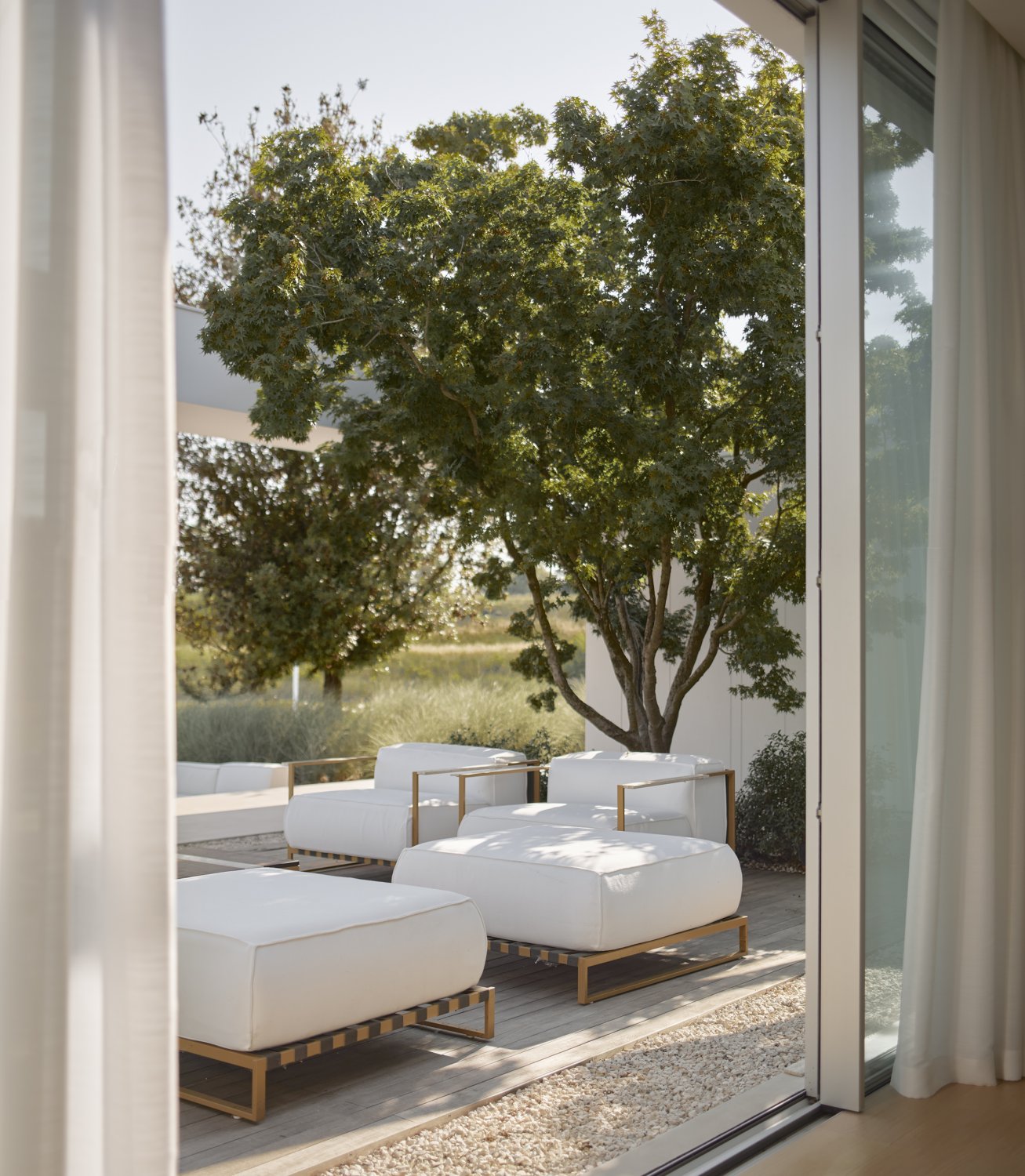 All’interno il giardino si sviluppa in parallelo alla piscina, fino a raggiungere un grande leccio che ombreggia il solarium e si specchia sull’acqua. Tra la piscina e la casa si apre una corte che ospita due aceri e un salotto rivolto verso il paesaggio lineare, mentre le ampie finestre delle camere si affacciano su alcuni cornus: il verde è la quarta parete di ogni ambiente.